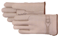 Cream color grain cowhide, all leather driver; full fit, gunn pattern with straight thumb for closed fist work. Matching leather draw strap at wrist with stainless steel buckle enabling snugness to individual taste. Wrap around construction of index finger eliminates one side seam for longer wear. Seam welts in palm stress areas. LM weight, side leather; brown edge binding. A tough glove for medium duty tasks. Made in the USA.
