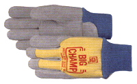 Pearl gray, M weight, side split cowhide. Wrap around index finger and full leather little finger. Thumb strap protects seam and protects from splinter intrusion. Leather fingertips, straight thumb and knitwrist with heel pull. Yellow canvas back with "BIG CHAMP" emblazoned in red letters. Light cotton inner palm lining to absorb hand moisture. Made in the USA.